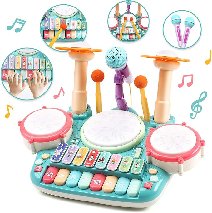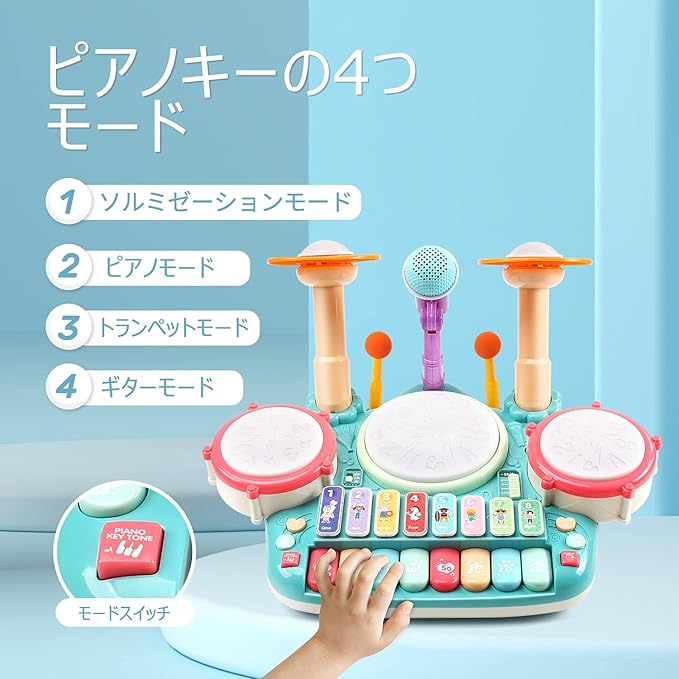 【3in1楽器玩具】この多機能の楽器玩具には、ドラムパッド、シンバル、ドラムスティック、マイクなどが付属し、3つの主要な楽器:ピアノキーボード、ビートドラムセット、電子木琴があります。更に、ピアノの4モード、木琴の4モード、ドラムの3モードとキーボードの4つの演奏方法があります。
