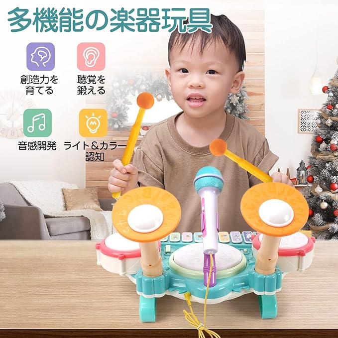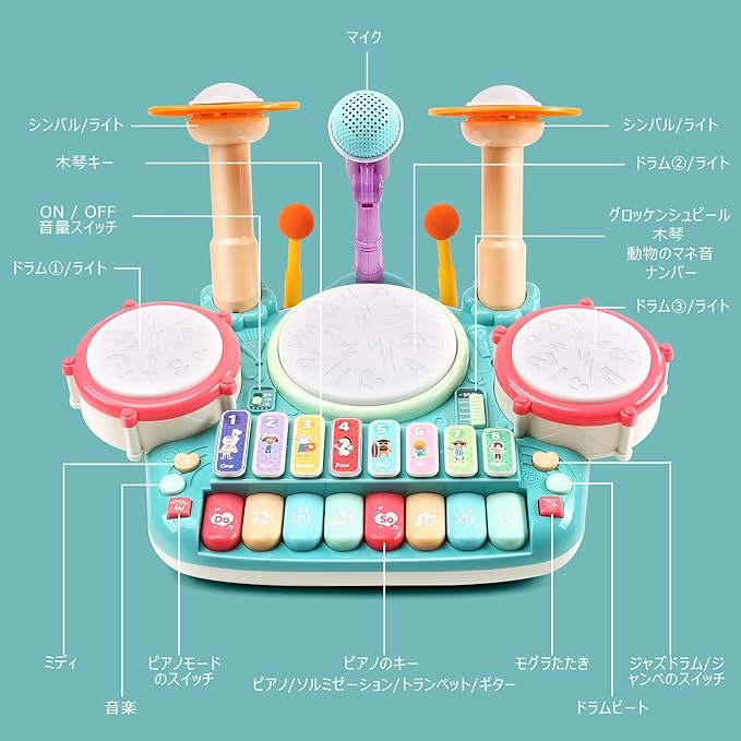【子供ための音楽教育】小さなミュージシャンのための完璧な学習音楽おもちゃになります。子供の音楽への興味を高め、子供の目と手の協調を強化し、ドラムを叩いてピアノキーボードを演奏することにより、細かい運動能力と聴覚感覚を発達させます。