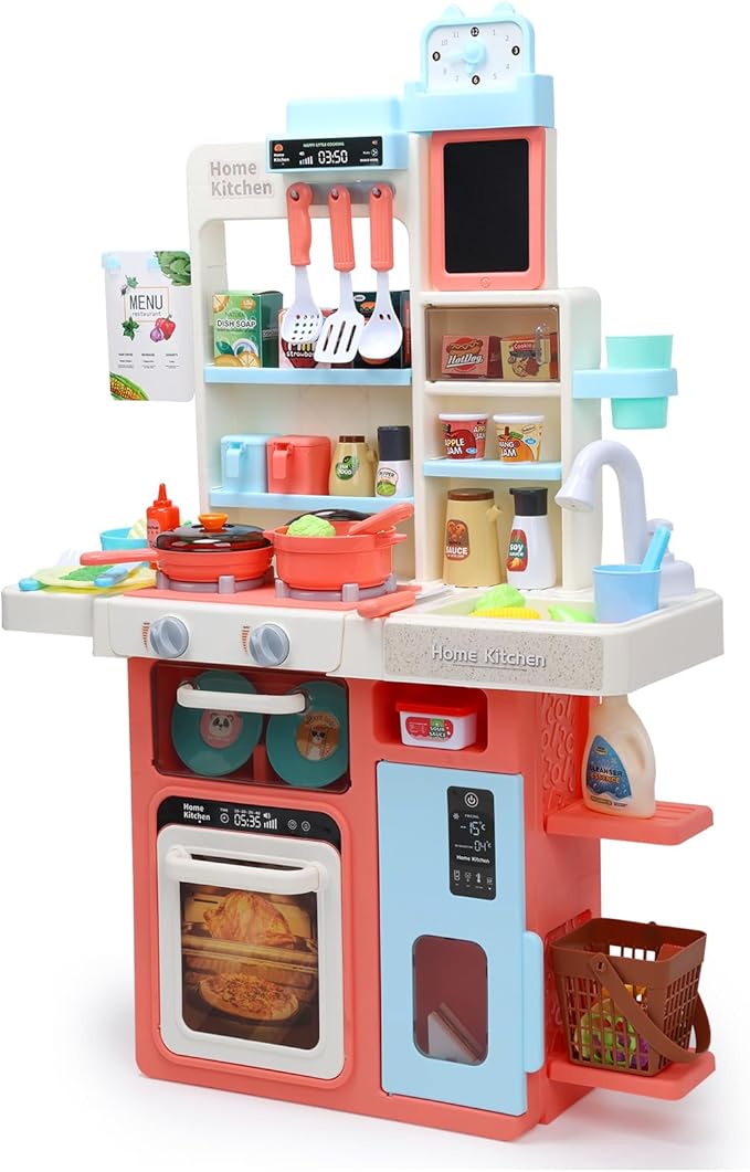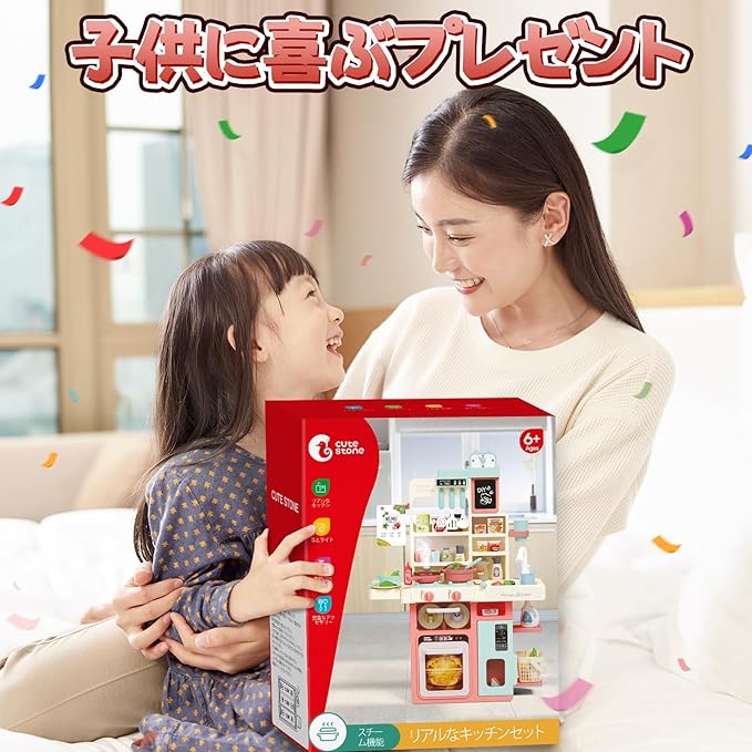 Cute Stone おままごとキッチン 知育玩具 64点 おままごと おもちゃ リアルスプレー ライトと料理音付き 循環出水 組立式 調理器具付き ごっこ遊び 豊富な食材 収納スペース 黒板付き 台所 子供 玩具 誕生日プレゼント