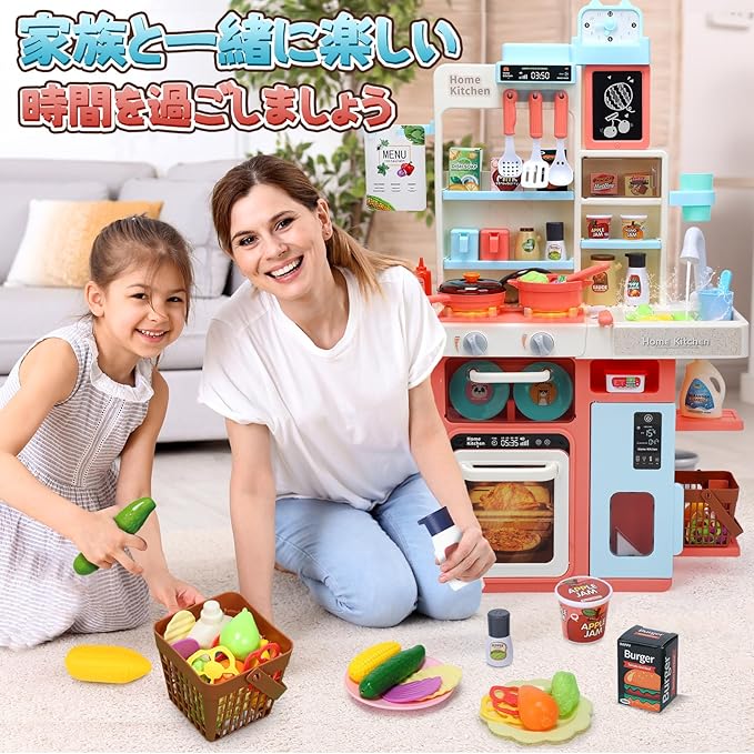 【豪華な64点セット】大きな台所本体、野菜、果物、調味料、キッチン用具、調理器具などバリエーション豊な64点セットで、お子様一人でも 、お友達や家族と一緒に楽しく遊びます。