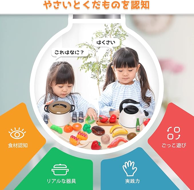 【食材を認知】このキッチンセットは、果物と野菜の種類が多いのですが、子供は遊びながら食材の名前もすぐに覚えられます。