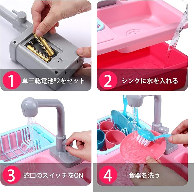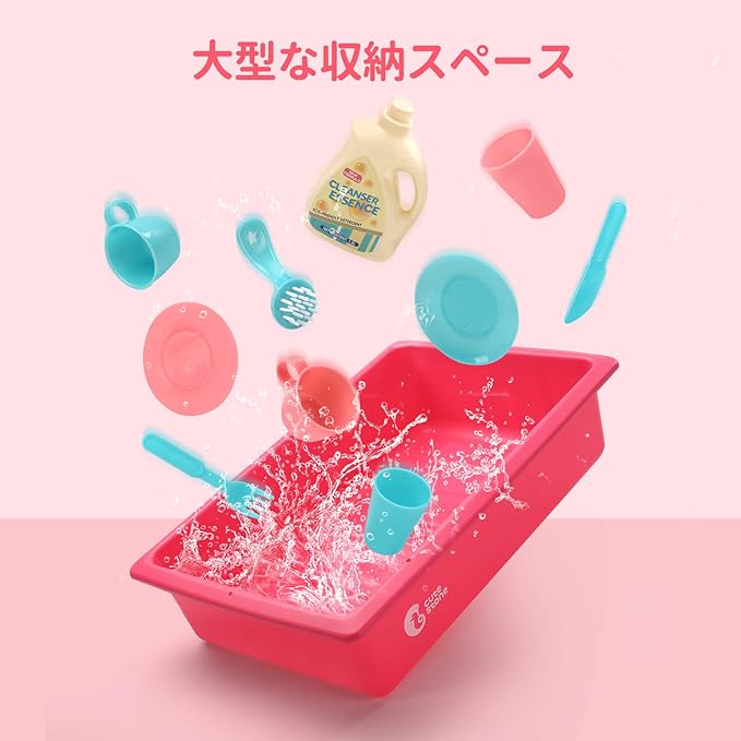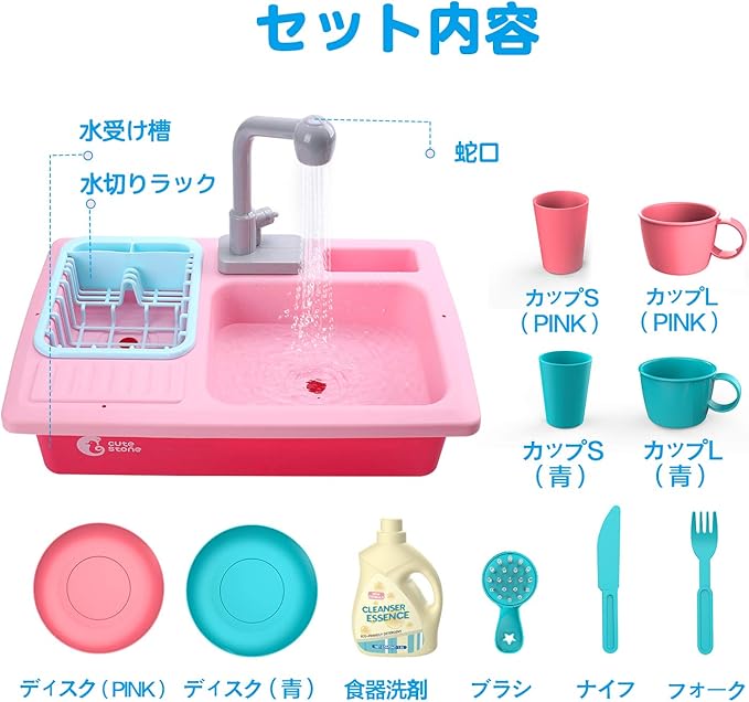 【シンク おもちゃセット】知育機能を持って、お子様を楽しく成長できよう!セット内容:水受け槽*1 排水弁*1 給水弁スイッチ*1 水切りラック*1 食器洗剤*1 青カップL*1 ピンクカップL*1 青カップS*1 ピンクカップS*1 青ディスク*1 ピンクディスク*1 青ブラシ*1 青ナイフ*1 青フォーク*1