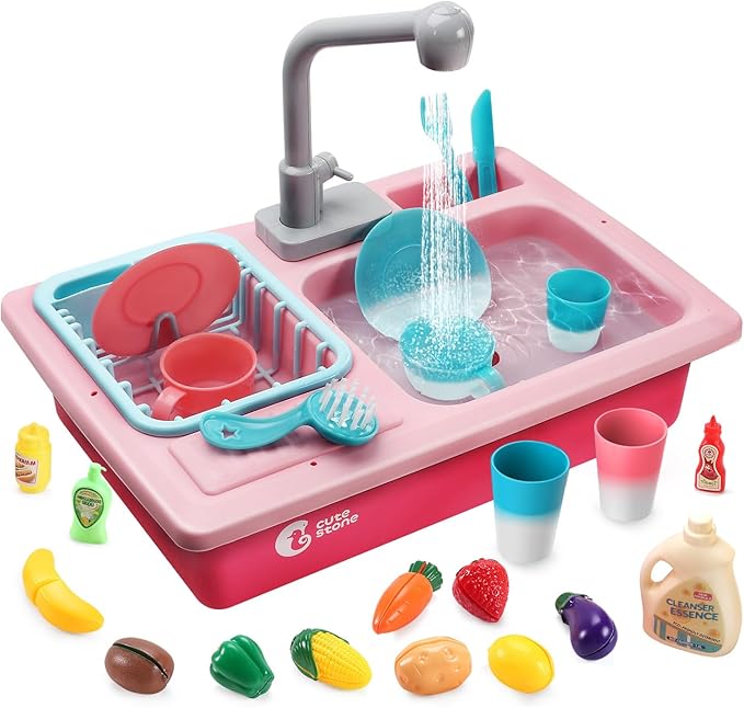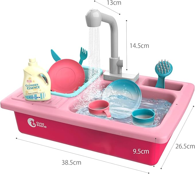 おままごと キッチンセット Cute Stone 37点セット 食器洗い機 水遊びおもちゃ シンク おもちゃ 循環出水 温度で色が変わる カップ お皿 切る可能 果物 調味料 ごっこ遊び 知育玩具 プレゼント 誕生日ピンク