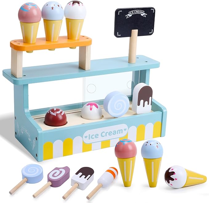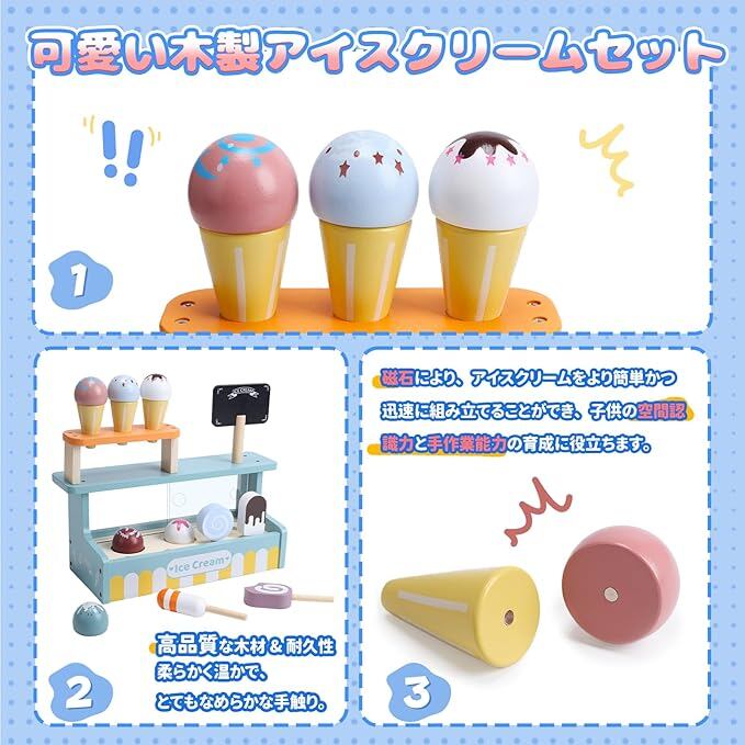 【高品質な木材と耐久性】このアイスクリームセットは、高品質な天然木材で作られており、すべてのアイテムの端は研磨されています。触り心地が非常に滑らかで、子供の小さな手を傷つける心配はありません。家の中や外、または幼稚園や教室など、どこでも持ち運んで遊ぶことができます。