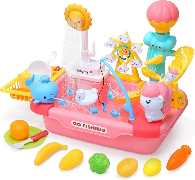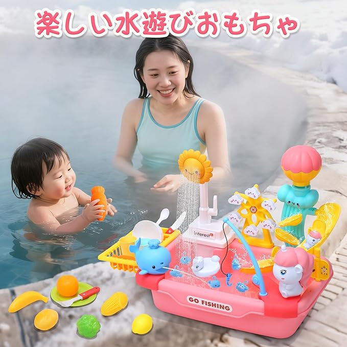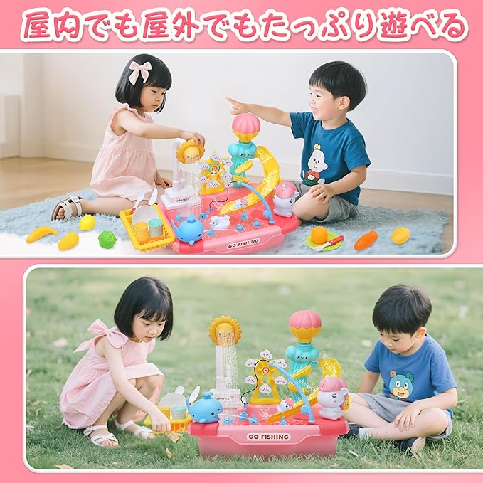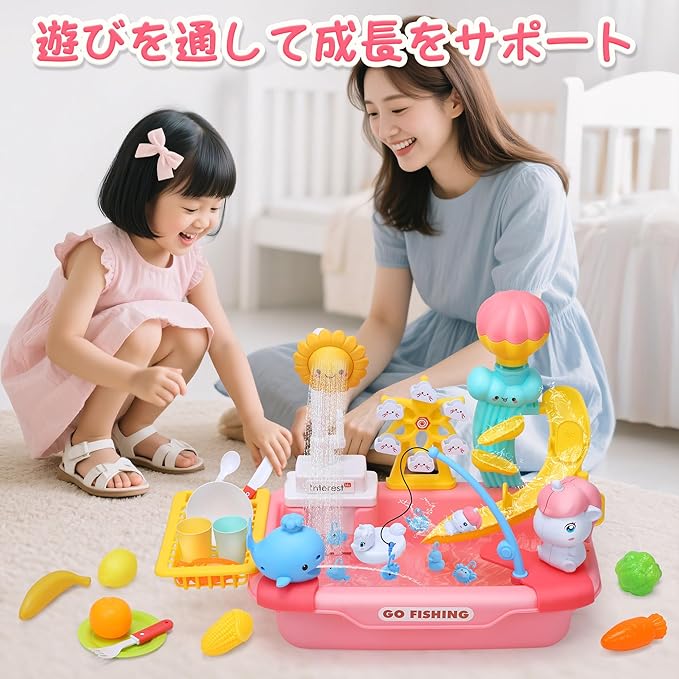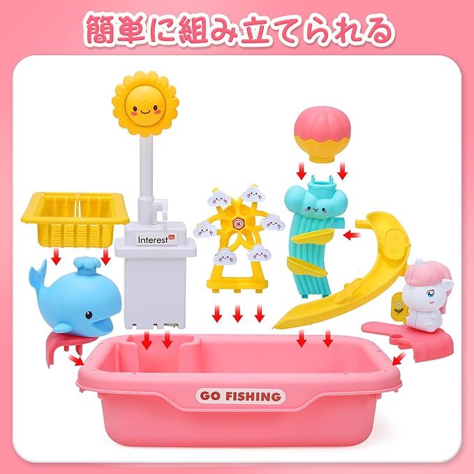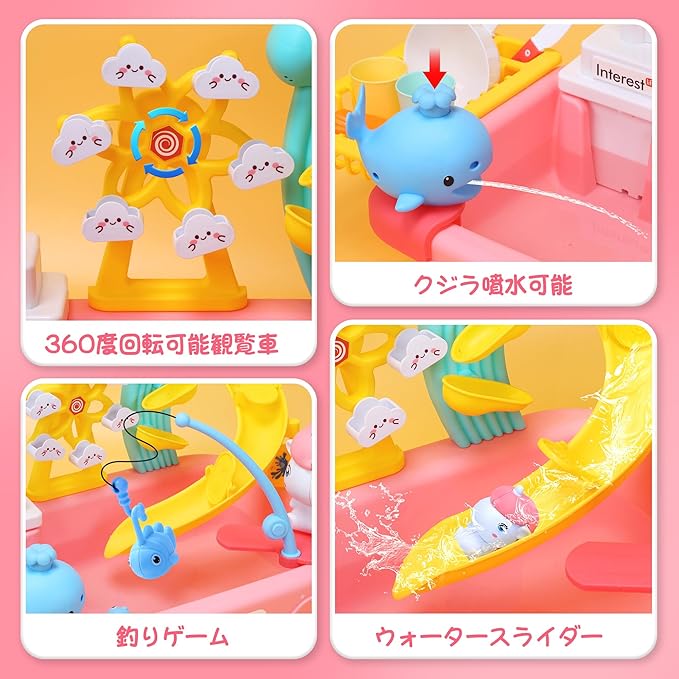 ✨【1台で遊園地気分!夢中になる6大遊び機能】✨水遊び 釣りゲーム 観覧車 スライダー クジラ噴水 浮遊気球が楽しめます。6Lの大容量シンクでたっぷり遊びながら、お子様の創造力を育むことができる知育玩具です。