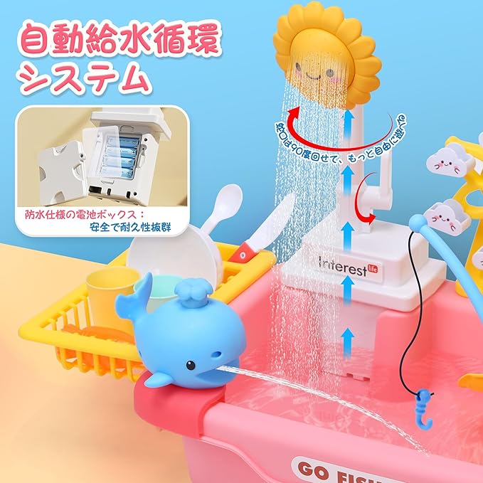 【節水設計でママも安心】90度回転するひまわり型蛇口と自動循環システムを搭載しておりますので、水を大切に使いながら長時間遊んでいただけます。防水仕様ですので、後片付けも簡単です。(※乾電池は別売です)