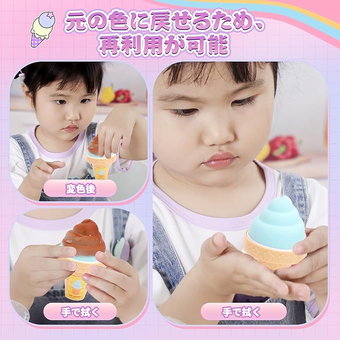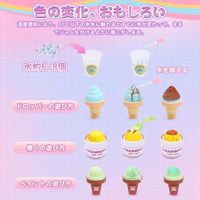 【温度感知で楽しさ倍増】10℃以下の冷たい水に触れると色が変わるおもちゃで、鮮やかなアイスクリームやデザートを作ることができます。35℃以上で元の色に戻るので、色の変化を楽しみながら科学の不思議に触れることができます。