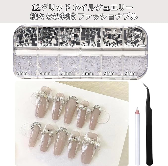 【商品仕様】ネイルアートラインストーンボックスには12個の小さな正方形があり、それぞれの正方形には異なる形と大きさのネイルアートラインストーンがあります。ネイルアートや小さなデコレーションに最適です。ピンセットとネイルアート用クレヨン付き。
