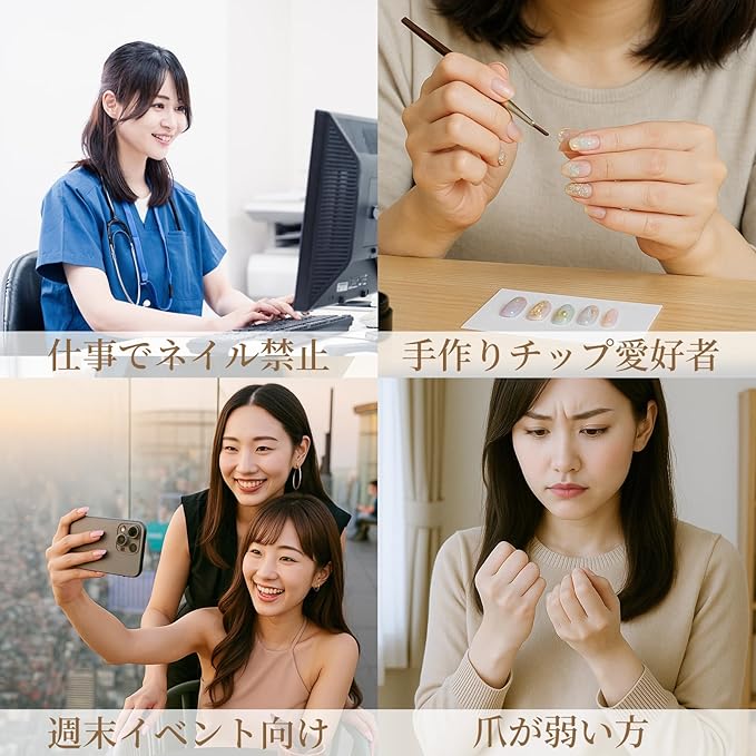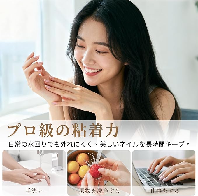 【自爪にやさしく、強力密着】:自爪のダメージが気になる方や、ネイルが制限されるお仕事の方にぴったりのネイルチップテープ。オフのときに爪を傷める心配がなく、それでいて驚くほどの粘着力でしっかり固定。さらに防水仕様で、家事や入浴後でも剥がれにくく、美しい仕上がりをキープ。※長時間の水濡れはお避けください。