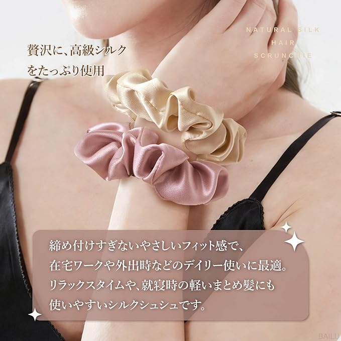 ✿【程よいホールド感で快適】 締め付けすぎないフィット感で、デスクワークや外出時など日常使いに最適。リラックスタイムや、シュシュ シルク 寝る時の軽いまとめ髪にも使いやすい付け心地です。