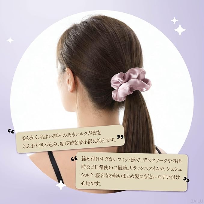✿【シュシュ シルク 跡がつかない】 なめらかなシルク素材が髪をやさしく包み込み、長時間結んでもシュシュ シルク 跡がつかない設計。外すときも絡まりにくく、抜け毛や切れ毛を防ぎます。