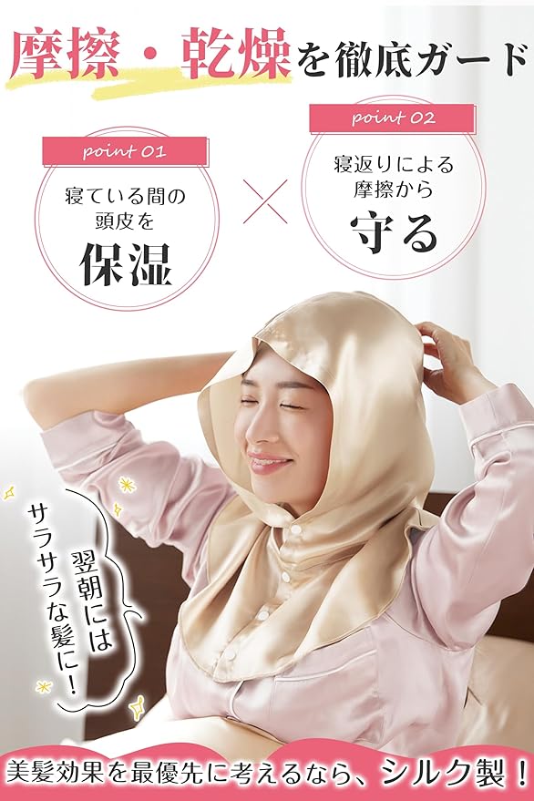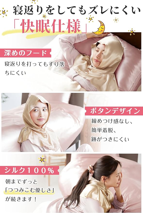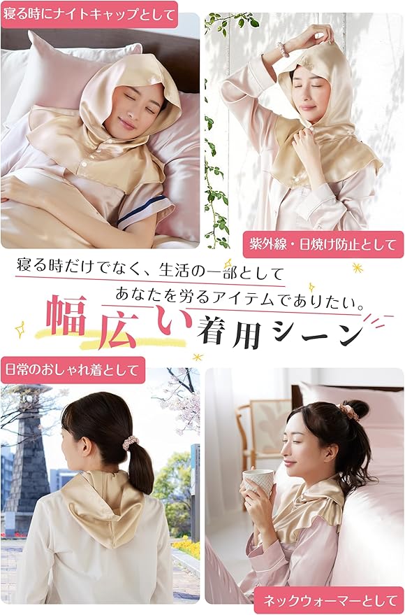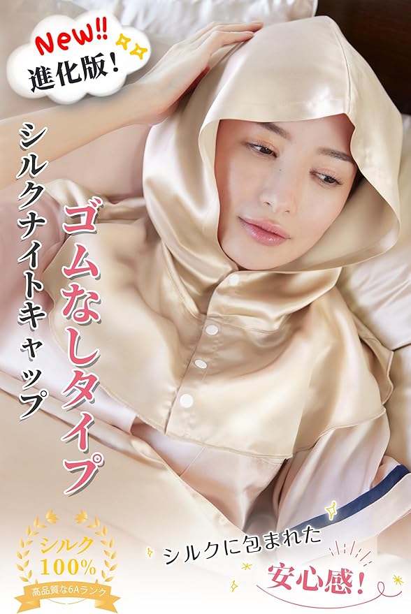 Utukkyは最高品質シルク100%のシルク製品を取り扱っております。ハイ限定商品などで使用されるものと同じ最高級6Aクラスの生地を厳選使用。世界に流通するシルクの80~90%が生産される中国の品質判断基準(糸の均一性、不純物の少なさ、羽毛の少なさ、引張強度、伸張度)から最も高品質な6Aのグレードを採用しています。日々シルク製品の調査と研究に専念し、オシャレな設計と実用的な機能を兼ね備えた安全な最高品質シルクを提供いたします。また、厳格な品質管理とアフターサービスにより、幅広い層のお客様にお選びいただけるシルク製品を提供いたします。 2024年夏秋新作・ロープタイプ帽子型シルクナイトキャップ、本シルクナイトキャップは筒型ヘアキャップとは異なり、フード型のデザインを採用しており、首の部分をすべて包み込みます。髪をケアするだけでなく、寝ている間の寝具との摩擦を減らす同時に、就寝中に気になる首と肩周りや頰などの冷えもケアすることができます。また、帽子のようにかぶるだけのフ一ドスタイルなので髪をキャップの中に入れる手間がなく、ボタンデザインでゴムがないので、着脱が簡単の同時に跡が付きにくく、朝の気持ちが明るくなる!フ一ドを深めに設計しており、寝返りなどで朝までずり落ちにくい!そして、寝る前につけるだけではなく、生活スタイルにより溶け込むこともできて、外出時に付けた違和感がなく自然なスタイルに!たっぷりのシルク生地で頭と首を隠し、サングラスを組み合わせることができます。簡単な日焼け止めとして、日光から髪や肌を守ります。プレゼントとして落ち着いた綺麗な色合と優雅な光沢で高級感溢れるシルク100%のナイトキャップで、自分を甘やかしてあげて下さい!また母の日、父の日、クリスマス、バレンタイン、新年などのイベント時に進化版シルクナイトキャップはプレゼントとしてもオススメ!誕生日、ご結婚、新居購入、進学就職などの祝い事に、ギフトとして喜ばれる事間違いなし!