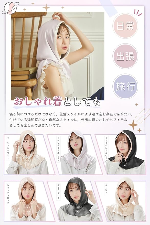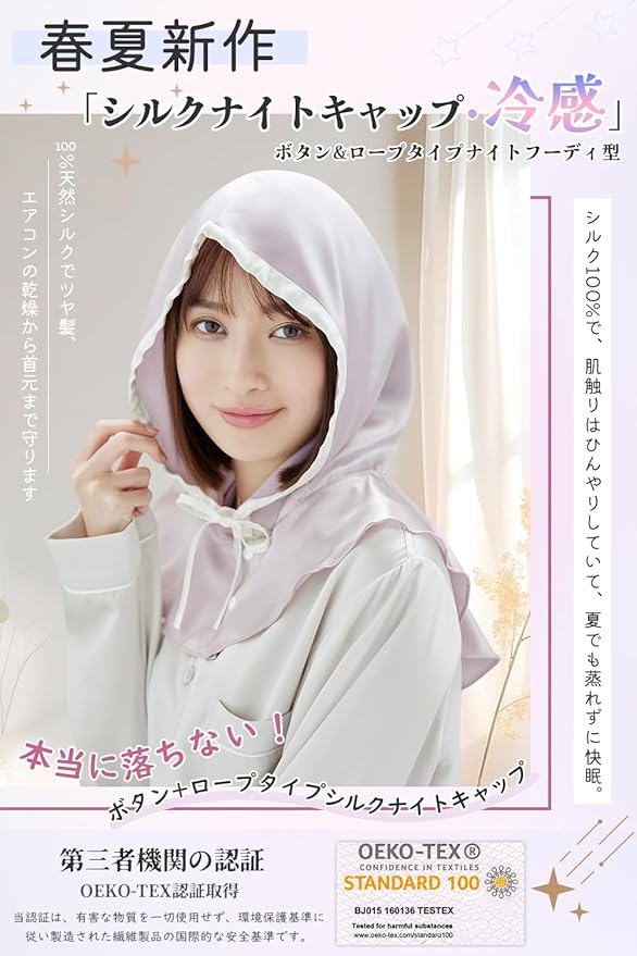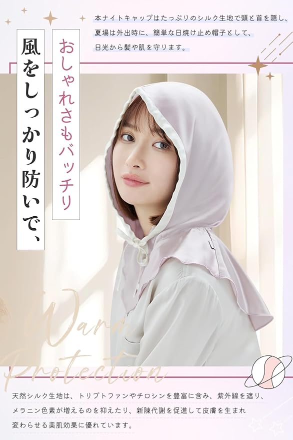 Utukkyは最高品質シルク100%のシルク製品を取り扱っております。ハイ限定商品などで使用されるものと同じ最高級6Aクラスの生地を厳選使用。世界に流通するシルクの80~90%が生産される中国の品質判断基準(糸の均一性、不純物の少なさ、羽毛の少なさ、引張強度、伸張度)から最も高品質な6Aのグレードを採用しています。日々シルク製品の調査と研究に専念し、オシャレな設計と実用的な機能を兼ね備えた安全な最高品質シルクを提供いたします。また、厳格な品質管理とアフターサービスにより、幅広い層のお客様にお選びいただけるシルク製品を提供いたします。 2024年夏秋新作・ロープタイプ帽子型シルクナイトキャップ、本シルクナイトキャップは筒型ヘアキャップとは異なり、フード型のデザインを採用しており、首の部分をすべて包み込みます。髪をケアするだけでなく、寝ている間の寝具との摩擦を減らす同時に、就寝中に気になる首と肩周りや頰などの冷えもケアすることができます。また、帽子のようにかぶるだけのフ一ドスタイルなので髪をキャップの中に入れる手間がなく、ボタンデザインでゴムがないので、着脱が簡単の同時に跡が付きにくく、朝の気持ちが明るくなる!フ一ドを深めに設計しており、寝返りなどで朝までずり落ちにくい!そして、寝る前につけるだけではなく、生活スタイルにより溶け込むこともできて、外出時に付けた違和感がなく自然なスタイルに!たっぷりのシルク生地で頭と首を隠し、サングラスを組み合わせることができます。簡単な日焼け止めとして、日光から髪や肌を守ります。プレゼントとして落ち着いた綺麗な色合と優雅な光沢で高級感溢れるシルク100%のナイトキャップで、自分を甘やかしてあげて下さい!また母の日、父の日、クリスマス、バレンタイン、新年などのイベント時に進化版シルクナイトキャップはプレゼントとしてもオススメ!誕生日、ご結婚、新居購入、進学就職などの祝い事に、ギフトとして喜ばれる事間違いなし!