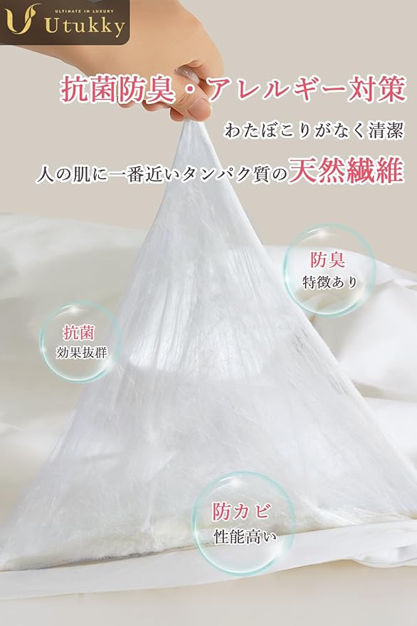【天然抗菌消臭&アレルギー対策】この高級布団には、自然由来の抗菌・消臭成分により、化学物質を一切使用せず、細菌の繁殖を抑制。汗をかきやすい方にも、不快なニオイを抑える優れた脱臭効果を発揮します。しっかり汗やニオイを抑える消臭性能。そして抜群の防カビ効果。清潔に過ごしたいあなたに、自然の力が詰まったシルク掛け布団をご用意しました。清潔で快適な眠りを手に入れ、最高の睡眠を体験ください。大切な毎日を、自然がサポートする布団がここに。清潔さという想いを形にするのが、Utukky真綿布団なのです。