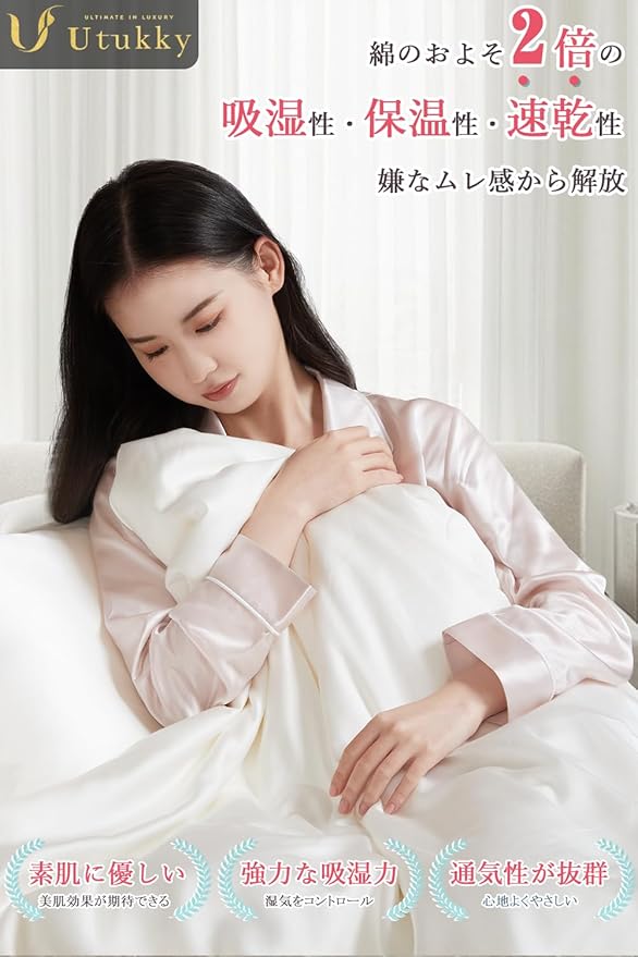 【シルク100%掛け布団 四季を問わず快適】最高級100%シルクを惜しみなく使用した極上のUtukky掛け布団です。表面には植物由来の天然繊維テンセルを採用。ほんのりひんやりとした触り心地で冷たすぎず、自然の力由来の快適さです。なめらかな繊維の肌触りは、敏感肌の方やお子様にもおすすめの上質さ。2cm程度のちょうど良い厚みで、春先から夏はもちろん、秋口まで長く使えます!気候の変化や夏の冷房から体を優しくお護りする、上質な一枚肌掛け布団です。