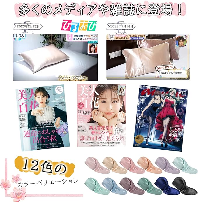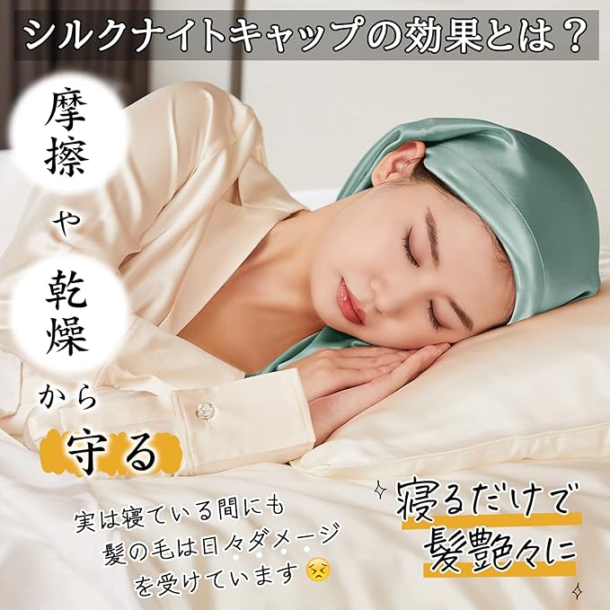 寝ている間の髪と枕の摩擦を最小限に抑えてくれるシルクのナイトキャップ「リボンタイプ」の商品です。 摩擦が少なくなることで髪も乱れにくくなるため、1本1本まとまり、翌朝、髪型が整いやすくなります。リボンタイプなので、頭の大きさに合わせて調節可能です。