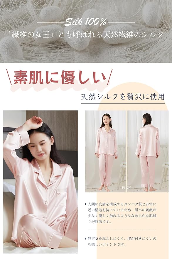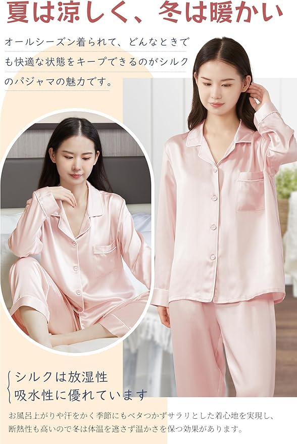 Utukkyシルク長袖パジャマは、通年で快適にお使いいただけるよう、通気性と吸湿性を両立させた優れものです。蒸し暑い夏の夜でも、シルクの涼しさが心地よい睡眠を保証します。さらに、シルクには適度な保温力があり、肌を過度に冷やすことなく快適な室温を保つことができます。夏でも窓を開けた涼しい夜は、シルクの暖かみで心地よく眠れます。一年を通じた着用に耐えうる天然素材のシルクレディースパジャマは、睡眠の質にこだわる方におすすめの逸品です。