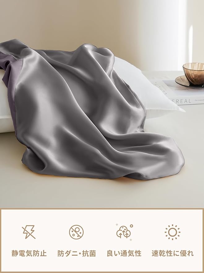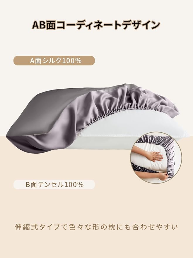 天然繊維:枕カバーのA面は、天然繊維100%のシルクから作られており、滑らかで光沢があります。枕カバーのB面は、天然繊維100%のテンセルから作られております。新開発の伸縮設計で色々な形の枕にも合わせやすいです。そして、着脱も簡単です。