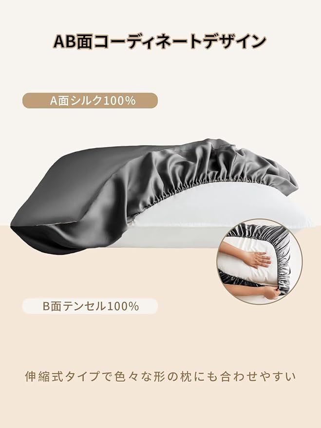 天然繊維:枕カバーのA面は、天然繊維100%のシルクから作られており、滑らかで光沢があります。枕カバーのB面は、天然繊維100%のテンセルから作られております。新開発の伸縮設計で色々な形の枕にも合わせやすいです。そして、着脱も簡単です。