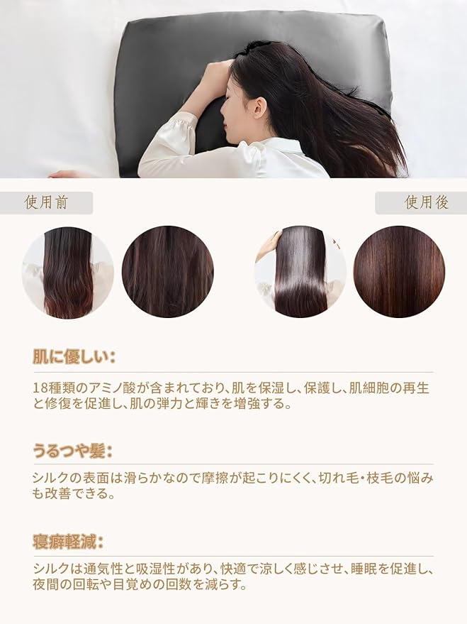美髪・美肌: シルクは、摩擦を軽減し、肌に潤いを与える優れた素材として、近年美容界で注目を集めています。 シルクの表面は滑らかなので摩擦が起こりにくく、切れ毛・枝毛の悩みも改善できます。 シルクの枕カバーは純綿の枕カバーより通気性に優れています。肌の水分を調節し、肌に栄養を与えます。シルクも、ダニやカビの繁殖を防ぎ、皮膚アレルギーを防ぐことができます。綿と比較して、シルクの枕カバーが最適な選択です!