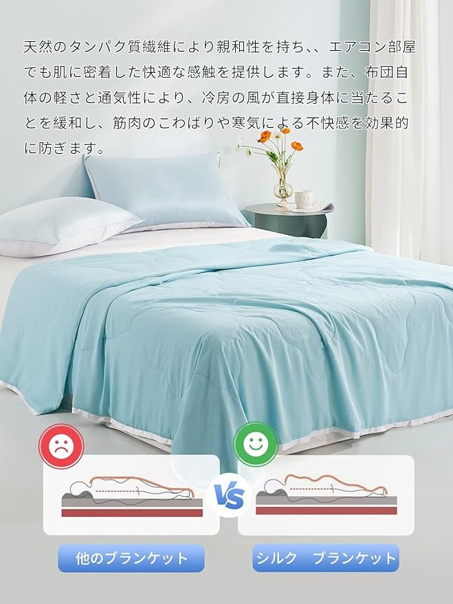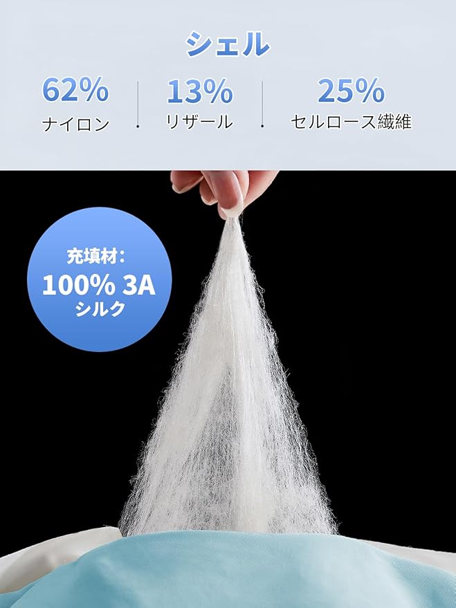 ★天然繊維: 100% 天然絹糸を使用しており、多孔質構造により優れた通気性を発揮します。体温を常に快適な状態に保ち、蒸れを防ぎ、敏感肌の方でも心地よく使用できます。特に夏場の快眠をサポートする「涼感指数 0.23」設計で、冷たすぎず快適な涼しさを提供します。