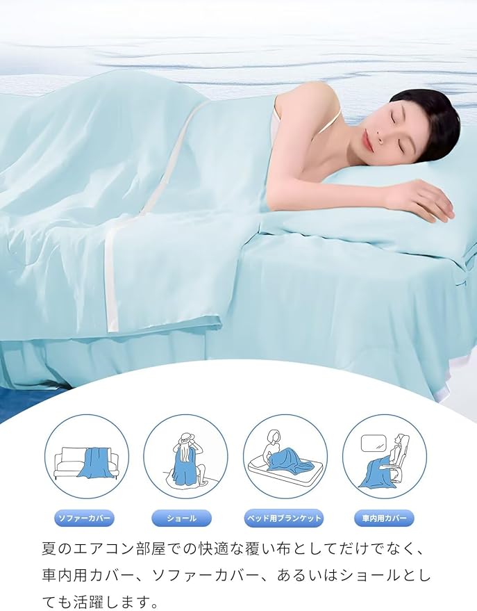 ★使い勝手の良さ: 夏のエアコン部屋での快適な覆い布としてだけでなく、車内用カバー、ソファーカバー、あるいはシュールとしても活躍します。一枚でさまざまなシーンに対応でき、使い道の幅広さとコスパの抜群さが魅力的です。