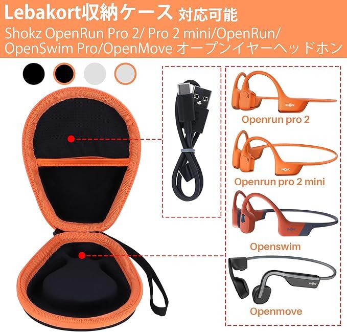 Lebakort 収納ケースは、Shokz OpenRun Pro 2、OpenRun Pro 2 mini、OpenRun、OpenSwim Pro、OpenMove、OpenRun Pro、OpenRun Pro mini のオープンイヤー型の骨伝導ワイヤレスイヤホンに対応しています。バッグ内部の上段には網袋があり、充電ケーブルなどの小物を収納することができます。下層には、Shokz OpenRun イヤホンを収めるための溝が設計されています。内側にベルベットを採用することで、衝撃や損傷から Shokz OpenRun Pro 2 mini、OpenSwim Pro オープンイヤーイヤホンを保護します。