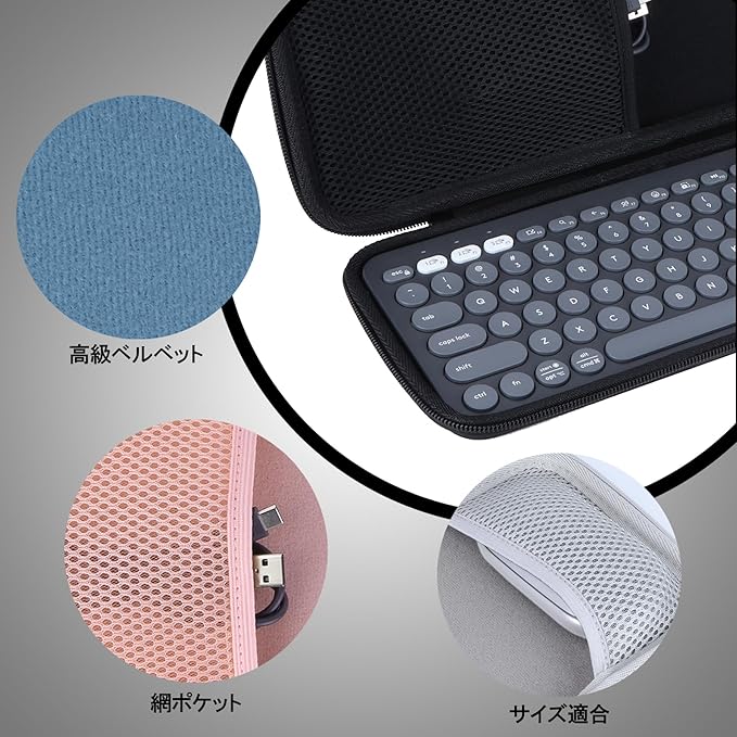 Peyyargo収納ケースの収納デザインは整理を簡便にします。上部に設けられたネットポケットで充電器などのアクセサリーを収納可能、下段の大容量スペースにはLogicool PEBBLE KEYS 2 K380s ワイヤレスキーボードをしっかり収められます。内部は柔らかいビロード生地ライナーで覆われ、キーボード表面の傷を全方位的に防ぎます。コンパクトサイズで省スペース、日常移動やビジネス外出に便利です。