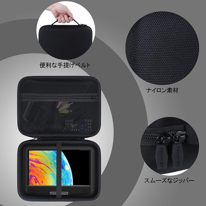 緻密な Peyyargo 収納ケースは、11.5-12.5 インチ Dbpower、11.5-12.5 インチ Iegeek 及び 11.5-12.5 インチ Cooau の三種ポータブル dvd プレーヤーに対応しています。Peyyargo 収納ケースは EVA 素材とナイロン素材を採用しています。その中でも、ナイロン生地は破損しにくく、長期間の使用に耐えられます。EVA 素材は防湿機能を持っており、11.5-12.5 インチ Dbpower や 11.5-12.5 インチ Iegeek の本体はもちろん、脆弱なバックモニターが湿気を帯びるのを防ぐことができます。内部には緻密なベロア素材を使用し、機器表面のスクラッチや衝撃による損傷を効果的に防止します。また、全体デザインは簡単で使いやすく、アウトドア視聴や旅行携帯に非常に適しています。