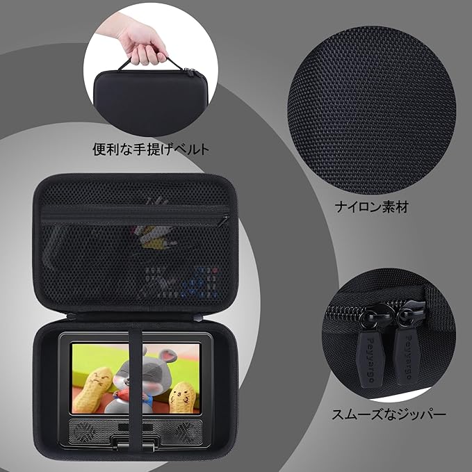 緻密な Peyyargo 収納ケースは、9.5 インチの Roommate、Surfola、Dbpower ポータブル DVD プレーヤーに対応しています。Peyyargo 収納ケースは EVA 素材とナイロン素材を採用しています。その中でも、ナイロン生地は破損しにくく、長期間の使用に耐えられます。EVA 素材は防湿機能を持っており、9.5 インチ Roommate や 9.5 インチ Surfola の機器本体はもちろん、脆弱なバックモニターが湿気を帯びるのを防ぐことができます。内部には緻密なベロア素材を使用し、機器表面のスクラッチや衝撃による損傷を効果的に防止します。全体デザインは簡単で使いやすく、アウトドア視聴や旅行携帯に非常に適しています。