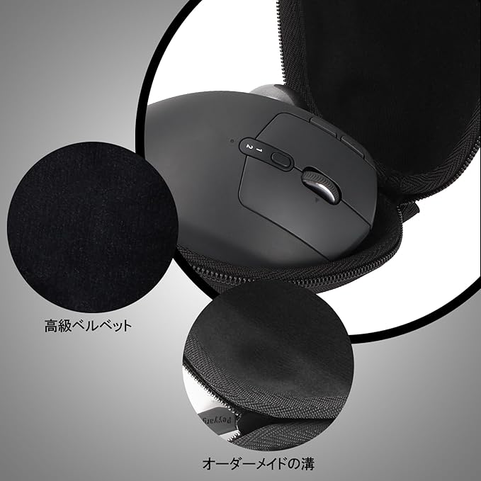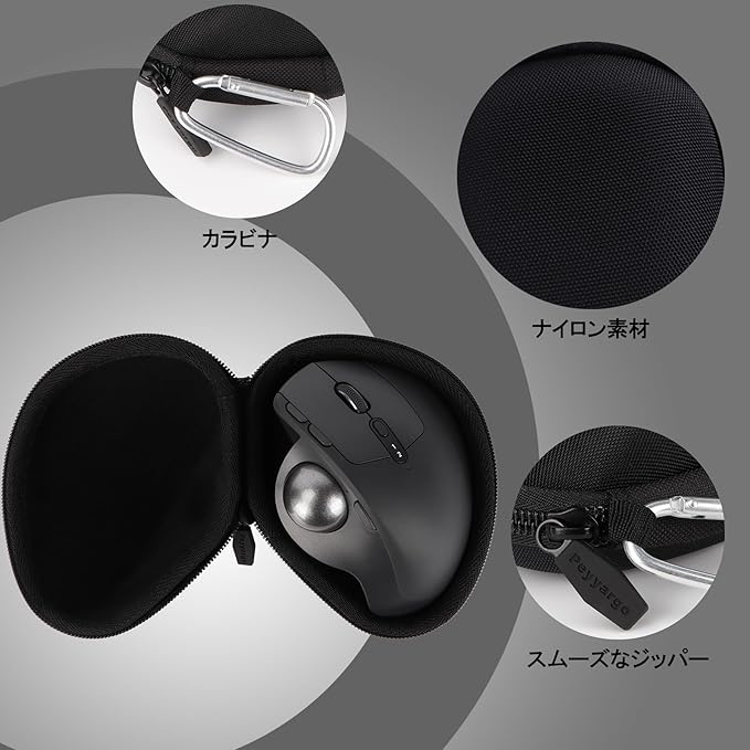 Peyyargo の収納デザインは整理を一層簡単便利にします。Peyyargo の Logicool MX ERGO、MX ERGO S、M575 ワイヤレスマウス用収納ケースは、効率的な収納を実現するための丁寧なデザインが随所に見られます。このマウス収納ケースのサイズは MX ERGO ワイヤレスマウスを安定して保護できるだけでなく、内部には柔らかいビロード素材のライニングが採用されており、Logicool MX ERGO S ワイヤレスマウスの表面を全面的に傷から保護します。Peyyargo のこれら 3 機種専用収納ケースは全体的にコンパクトなサイズで、スペースを過度に占有しません。日常的に優れた使い勝手を提供するほか、持ち運びも容易で、大きな負担もかけません。
