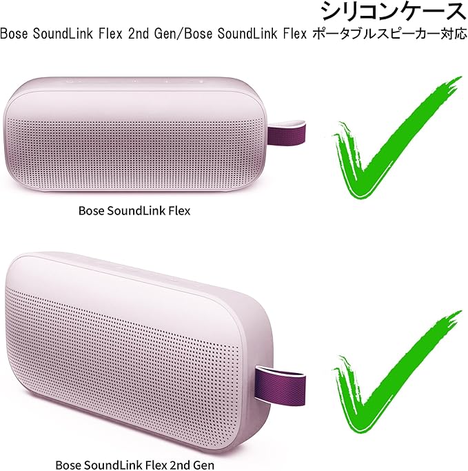 Peyyargo シリコンケースは Bose SoundLink Flex Portable Speaker (第2世代)、Bose SoundLink Flex Portable Speaker に対応しています。Peyyargo シリコンケース表面の滑り止めと快適なグリップ感で、Bose SoundLink Flex 1st Gen、Bose SoundLink Flex 2nd Gen を持ったときは汗をかいてもすべりにくく、片手で簡単に取り出せます。また、両機種の携帯中の持ちやすさも向上させます。短い旅行でも荷物の中に入れて持ち運びしやすくなります。ご注意:本商品は Bose SoundLink Flex Portable Speaker (第 2 世代) 及び同機種基礎款 専用シリコンケースのみです。Bose SoundLink Flex Portable Speaker (第2世代)、Bose SoundLink Flex Portable Speaker 本体及びその他付属品は含まれません。