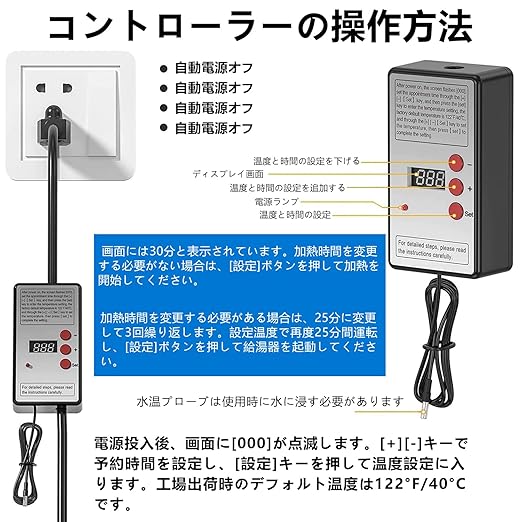 投げ込みヒーター 【2025新型】 スイッチ付き浴槽用給湯器 2000W電気給湯器 温度調整機能付 タイミング機能 自動電源オフ 空焚き防止 ポータブルバケットヒーター 家庭 アウトドア 学校に適しています (ワイヤーたわしと日本語マニュアル付き) (定温自動オフ機能付きタイプ)