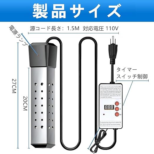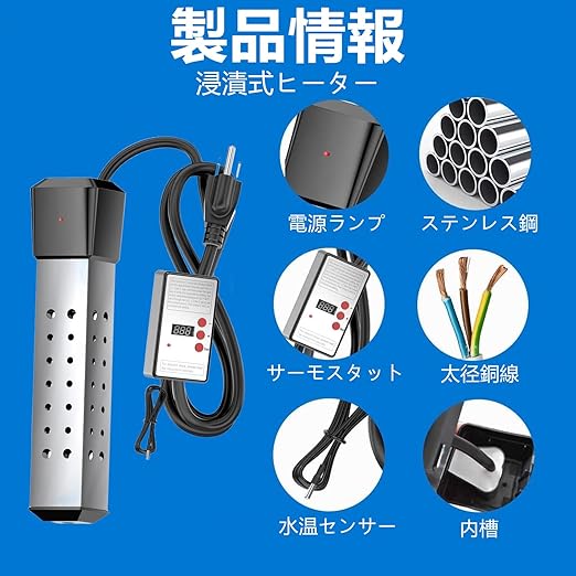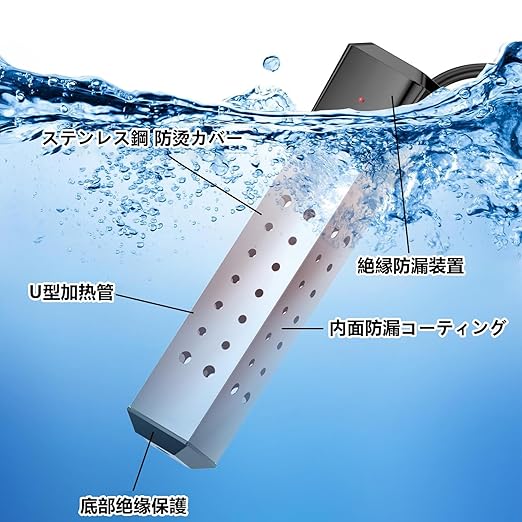 ♨️【 堅牢・安全・長寿命】:サビに強いSUS304ステンレス鋼材を採用し、過熱保護機能を装備。機器の長期的な安定動作を保証します。浸漬式ヒーターとして、使用時は必ず水中に完全に沈めてご利用ください。 これにより、湿潤環境への適応と操作安全を確保します。