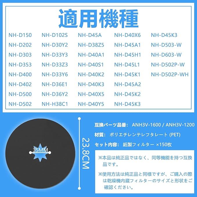 【乾燥機 フィルターの対応機種」】:衣類乾燥機専用紙フィルターは、サイズが一致する場合、他のHOTの乾燥機でも使用可能です。特に、ANH3V-1600およびANH3V-1200モデルに対応しています。さらに、以下の部品番号にも対応しています:NH-D503、NH-D603、NH-H38C1、NH-D500、NH-D40X5、NH-D45A1、NH-D45L1、NH-D502P-W、NH-D30Y2、NH-D33Y3、NH-D33Y6、NH-D33Z3、NH-D353、NH-D36E1、NH-D36Y2、NH-D38Z5、NH-D40A1、NH-D40K2、NH-D40K3、NH-D40X6、NH-D40S1、NH-D40Y5、NH-D45A、NH-D45A2、 NH-D45H1、NH-D45K1、NH-D45K2、NH-D45K3、NH-D102S、NH-D150、NH-D202、NH-D303、NH-D400、NH-D402、NH-D502、NH-D502P-WH(対応機種をご確認のうえ、お買い求めください。)