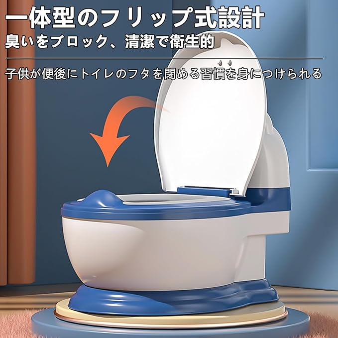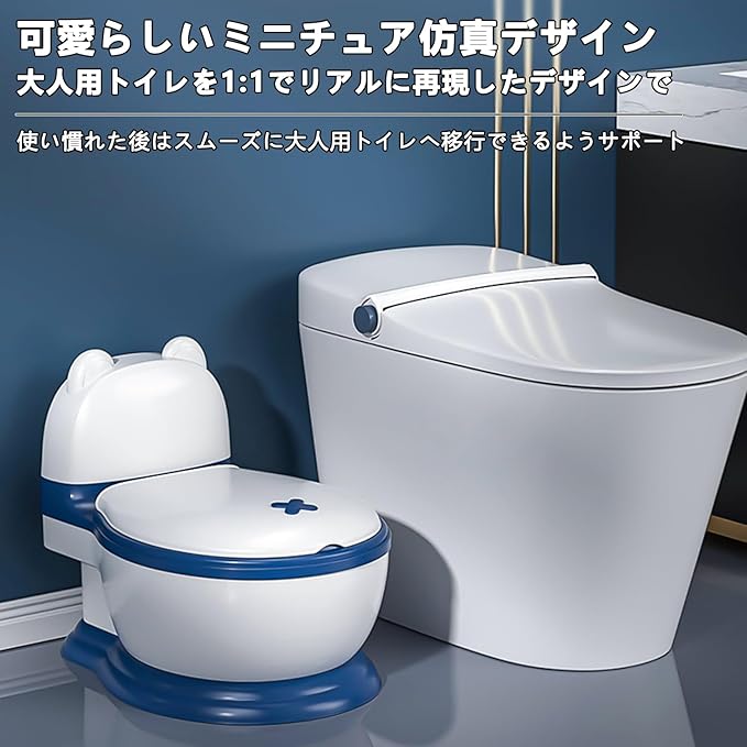 【楽しいトイレトレーニング】:このトイレトレーニングポットは、お子様が自信と自立心を育むのをサポートします。1:1で大人用トイレを再現したデザインで、お子様がトイレを認識しやすく、スムーズに大人用トイレへ移行できるよう設計されています。お子様が楽しく快適に学べる環境を提供します。
