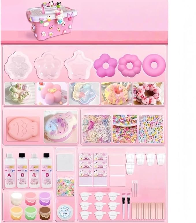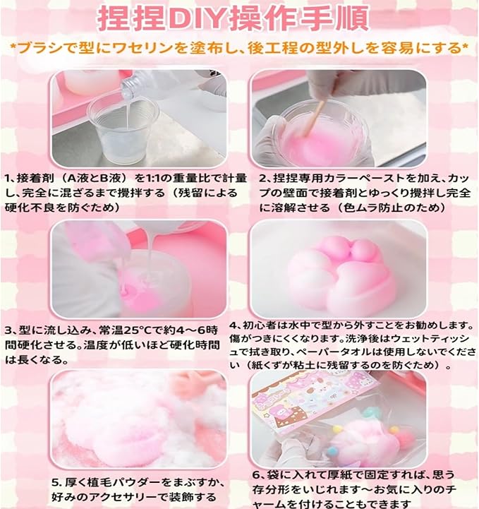 スクイーズ手作りキット DIY初心者も簡単!日本語説明書 収納ボックス付き 動物・ゼリー・肉球モールド ふわふわ握ってストレス解消、癒しの感覚おもちゃ クリスマスや誕生日の手作りプレゼントに最適 (ピンク, 200ml胶 6 種類の型枠)