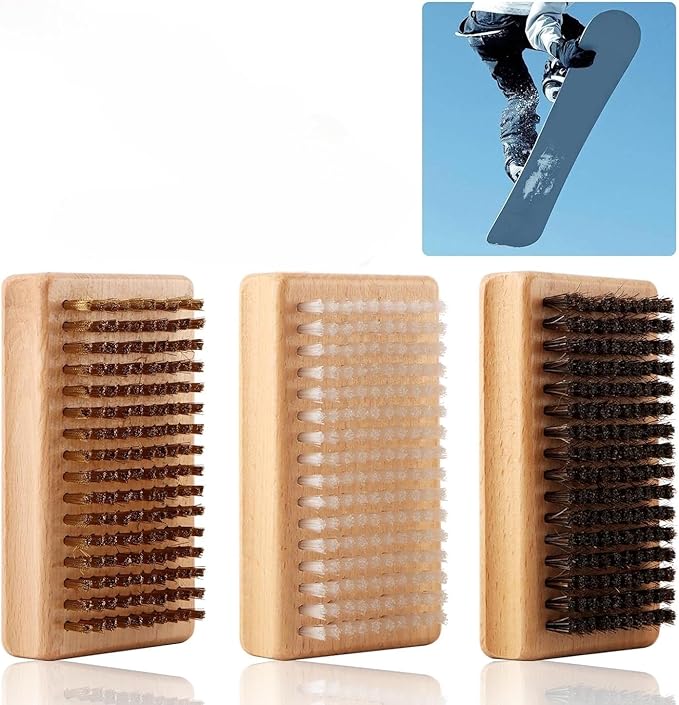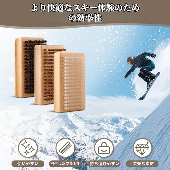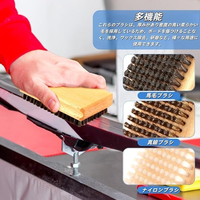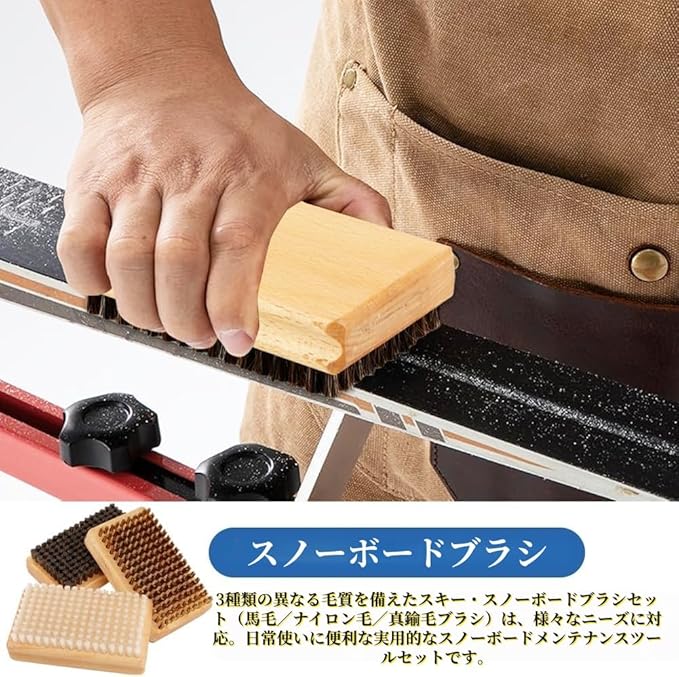 【製品内容】3種類の異なるブラシ毛を備えたスキー板ブラシセット。馬毛ブラシ、ナイロンブラシ、真鍮ブラシが含まれており、様々なニーズに対応。日常的なスキー板メンテナンスに実用的なツールセットです。