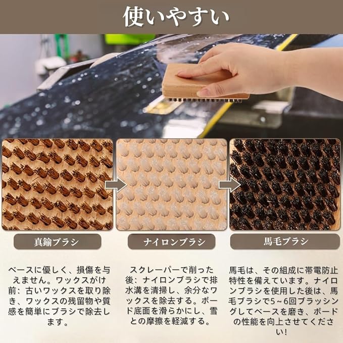 【使いやすい】ワックスを塗る前に、銅線ブラシを使って古いワックスを取り除き、ナイロンブラシを使って排水溝を掃除して余分なワックスを取り除き、馬毛ブラシを使ってボードの底を数回磨いてスキーの性能を向上させます。