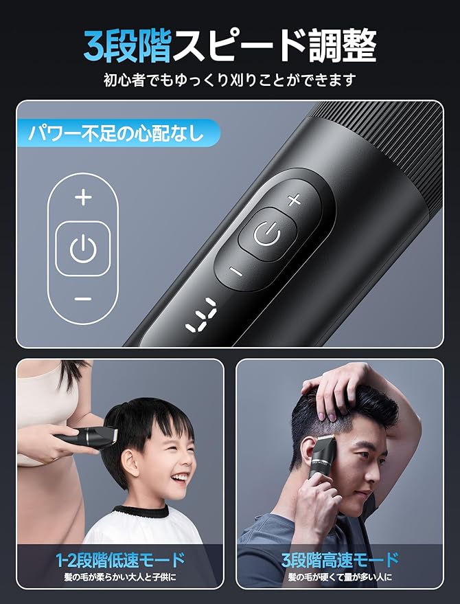 【3段階スピード&5段階刈り高さ調節】このヘアーカッターは、3段階スピード設定と5段階刈り高さ調節が可能です。スピード設定により、髪質や毛量に応じて最適なカットスピードを選べます。また、刈り高さ調節は簡単で、希望のスタイルに合わせたカットが可能です。これにより、プロフェッショナルな仕上がりを自宅で簡単に実現できます。セルフカットにも適しており、坊主やツーブロックなど多様なスタイルに対応できるこのバリカンは、家族全員で使用できる便利なアイテムです。