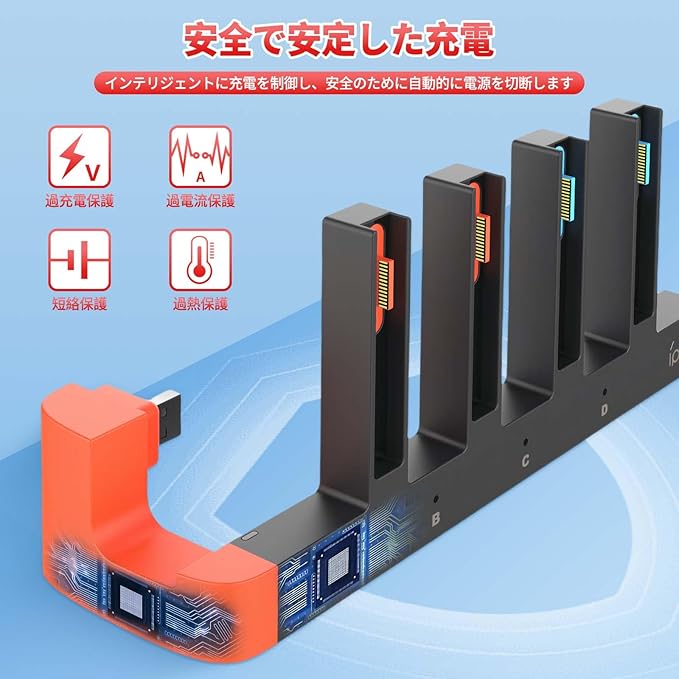 【便利性と安全性】置くだけで充電でき、傾斜角度設計で持ちやすい4つの充電スロットがあり、DC5V電力出力、過充電保護回路内蔵で、そして過度充電を自動的に充電を停止する、