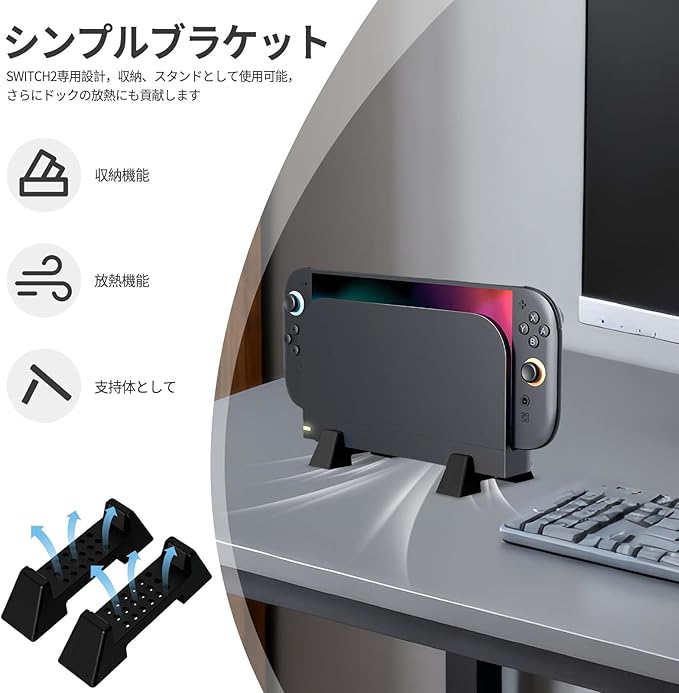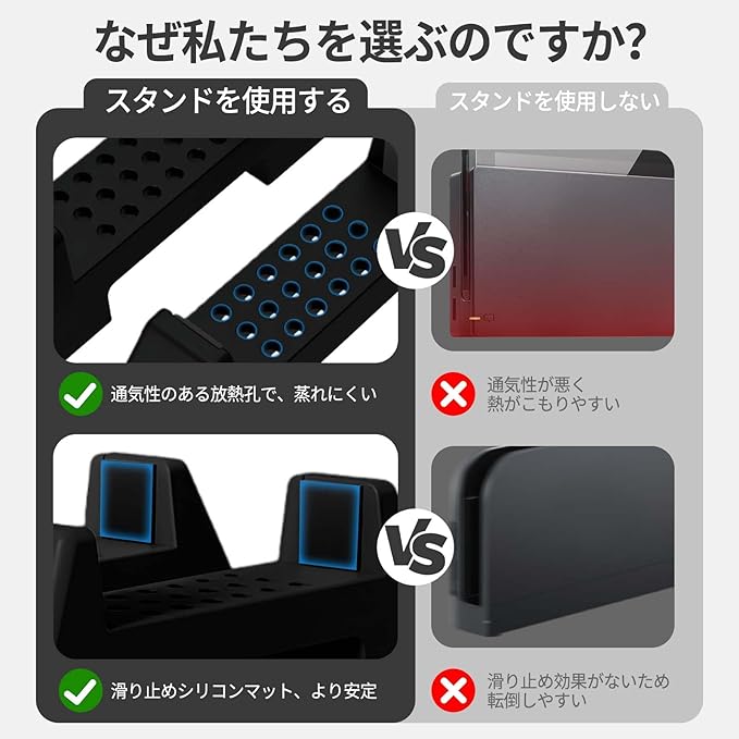 【対応機種】Switch 2 /Switch 有機ELモデル/旧型Switch ドック専用の縦置き収納スタンドです。Switchの下部に隙間ができ、地震対策 放熱改善 通気性が良くて熱がこもりにくくなります!