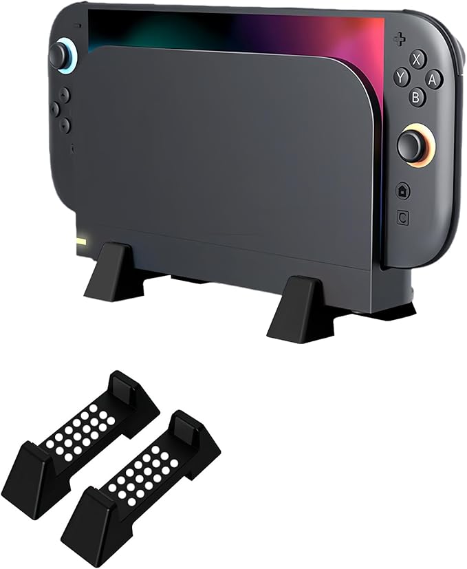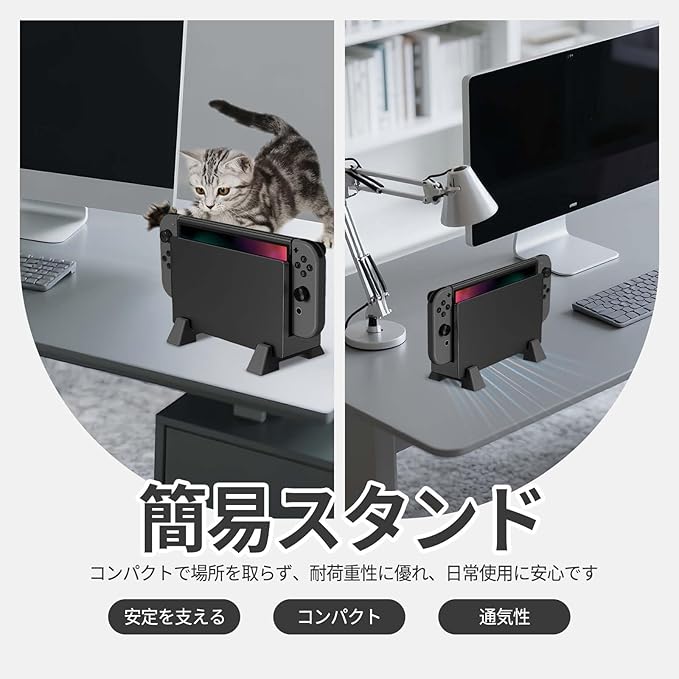 【放熱改善】Switch 2 /Switch 有機ELモデル/旧型Switch ドック用本体を横に置きして、放熱穴は底から側に変わって、下に隙間空くんで空冷感がまして、放熱穴は底から側に変わって、熱がこもりにくく、効率よく内部の熱を側から外へ排出、本体の使用寿命は大幅アップします。