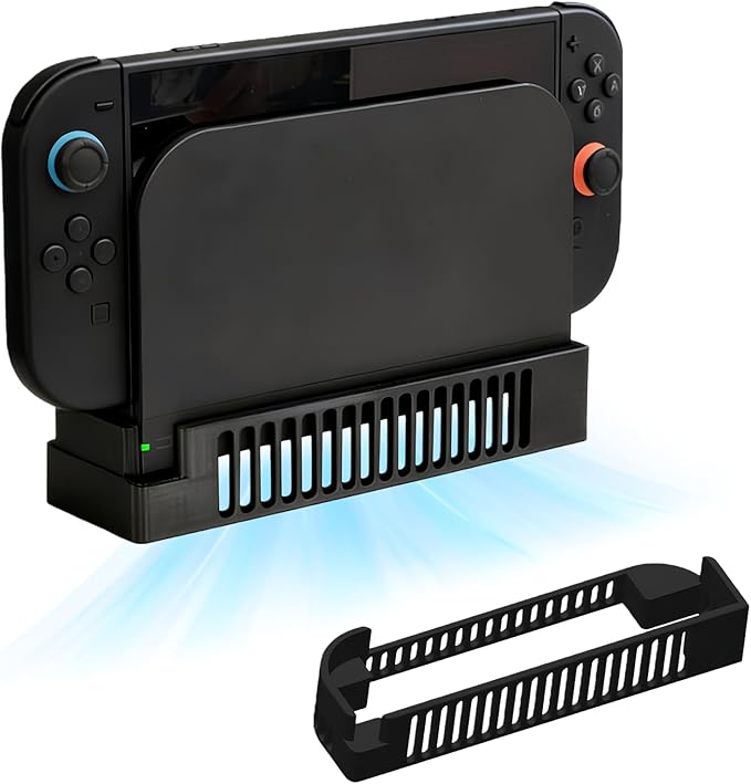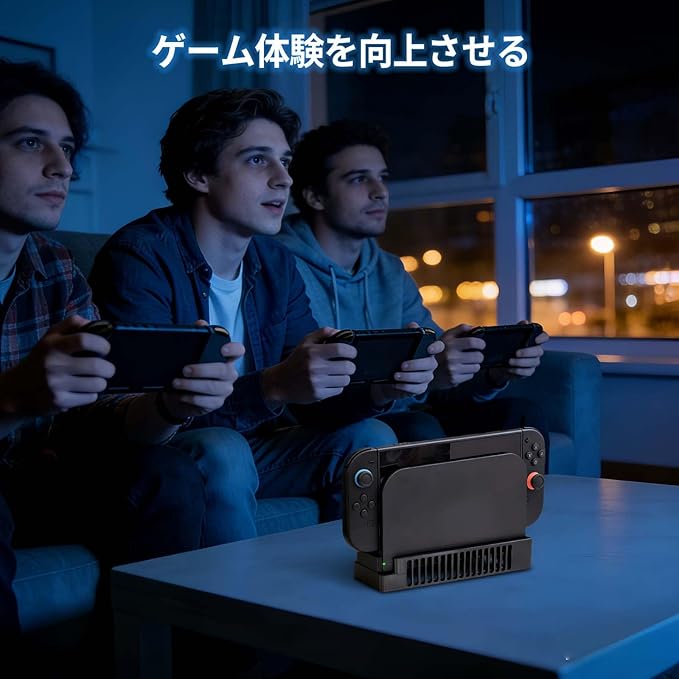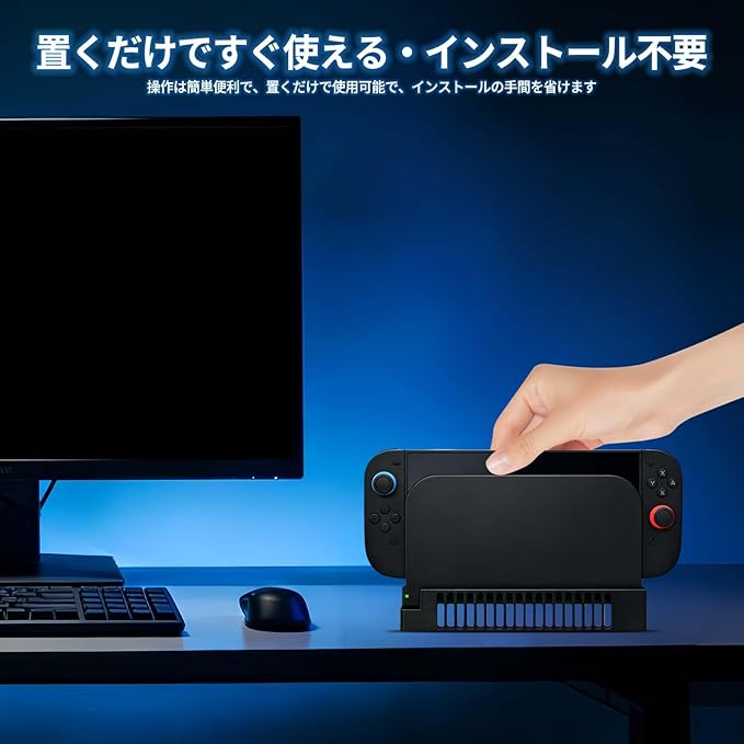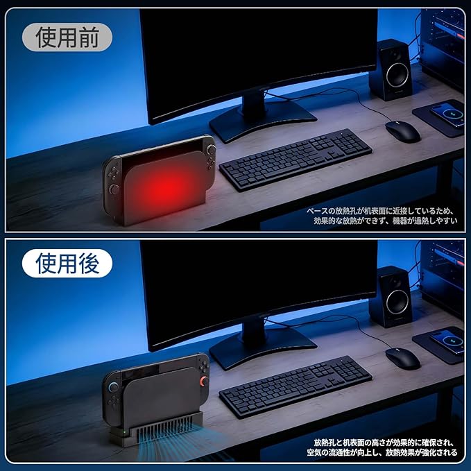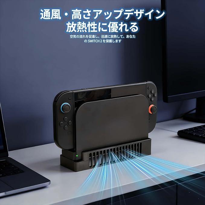 【放熱改善】Switch 2 ドック用本体を横に置きして、放熱穴は底から側に変わって、下に隙間空くんで空冷感がまして、放熱穴は底から側に変わって、熱がこもりにくく、効率よく内部の熱を側から外へ排出、本体の使用寿命は大幅アップします。