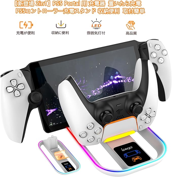 【対応機種】 PS Portal リモートプレーヤー 用 充電器+PS5コントローラー充電スタンド,(Type-C充電ケーブル*1、充電スタンドx1、)。ただ置くだけで充電可能です。
