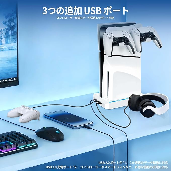 新型PS5 Slim用 縦置きスタンド 冷却 コントローラー ヘッドホンハンガーホルダーセット【2026 新登場- 壁掛けと水平置きに対応】 Tomistan RGBライト搭載 滑り止めパッド付き PS5 Slim ディスク/デジタル版兼用 3つのUSBポート 転倒防止・地震対策・放熱対策・傷付き防止・収納・ABS素材 簡単取り付け 安定性 PS5 周辺機器