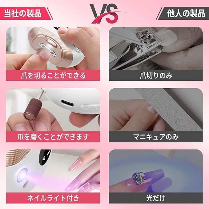 【電動爪やすり&爪磨きが1台で完了 】 爪切りと爪とぎは同時に行う最新設計の電動爪切りの2つの機能を1台で実現,電動つめきりは高品質合金で作られた螺旋状の刃、電源を入れるとが45 で高速回転し、アップグレードモーターと防護バー技術の組み合わせ、指を傷つける心配なく簡単に爪をきれいにすることができます。 忙しい毎日でも、時短で効率的にネイルケアが可能です。