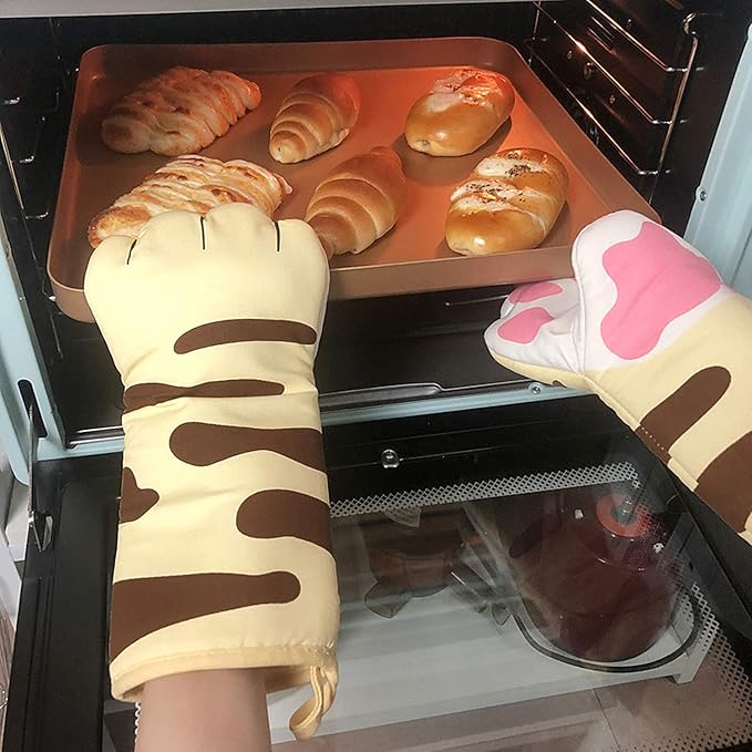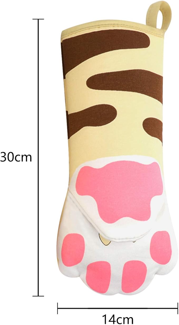 鍋つかみ 耐熱手袋 オーブンミトン オーブングローブ ロング 耐熱ミトン キッチン手袋 長袖 可愛いネコ 滑り止め 厚手 コットン 電子レンジ グリル バーベキュー BBQ用グローブ 手保護 調理手袋 ストライプ付き 両手セット ネコの爪柄