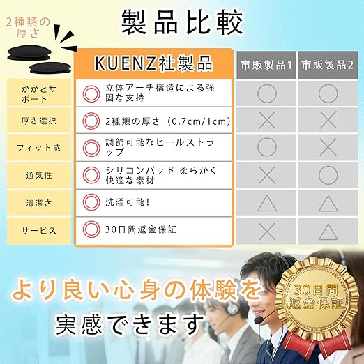 【衝撃吸収設計、歩行快適性】:アーチサポートが足裏のアーチを優しく支え、足の自然なカーブに沿ってフィットします。足に密着し、歩行時の衝撃を効果的に吸収。足底とかかとの圧力を分散させるため、長時間歩行や立ち仕事でも快適さを維持。さらに歩行姿勢を矯正し、膝や股関節への負担を軽減します。