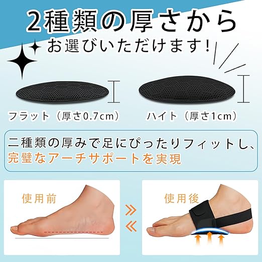 【新しいアップグレードデザイン】: 取り外し可能な2種類の高さのアーチサポートパッドが付属しているので、自分のニーズに合ったアーチサポートを選ぶことができます。アーチにフィットします。調節可能な固定ストラップは通気性の良い伸縮素材でできており、ほとんどの人にアーチサポートを提供できます。歩行時の衝撃を緩和します。我慢できない足の疲れや痛みをやさしくサポートします。